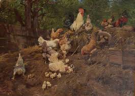 Aranyos, kedves kép, amint a baromfi udvar életre kel, kora reggel!
